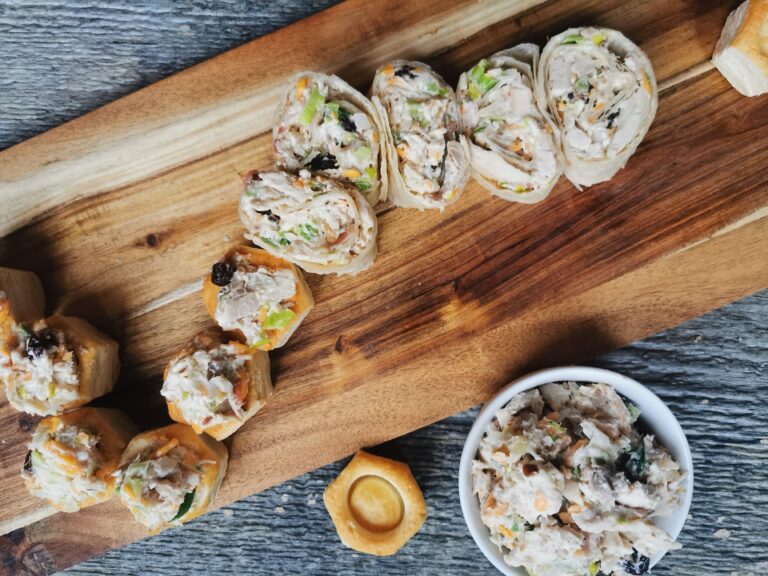 On peut même utiliser la recette de la salade de poulet dans des mini vols-au-vent, sur ces craquelins, des croûtons, des endives, dans des chips de maïs ; les possibilités sont infinies 😀