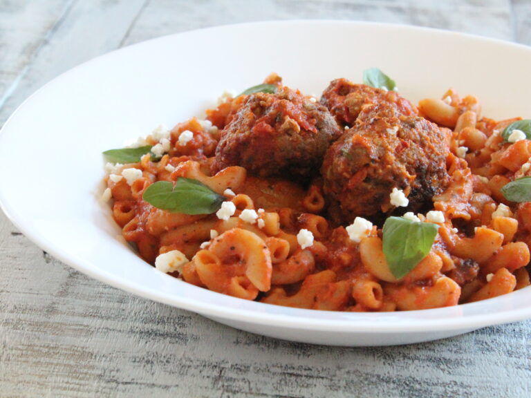 Ici, j’ai déposé les boulettes sur du macaroni à la sauce tomate et j’ai garni le tout de basilic frais et de fêta émietté.