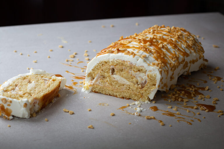 - Étendre environ la moitié du crémage sur le gâteau pour bien le couvrir puis verser le caramel.Doucement, rouler le gâteau en décollant le papier parchemin au fur et à mesure. Placer le gâteau sur une assiette de service. Étendre le restant du crémage, saupoudrer de flocons d'érable et verser de petits filets de caramel sur la bûche.