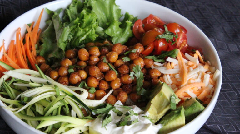 Dans la recette proposée, j’ai voulu donner un beau petit punch mexicain à la recette avec la présence de crème sûre, d’avocat mais surtout, des pois chiches rôtis à la mexicaine.
