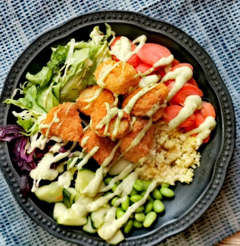 - Dans un bol, déposer le millet. Par section, déposer le légumes puis déposer les croquettes au centre. Dans un petit mélanger, déposer tous les ingrédients pour la mayonnaise et réduire jusqu'à ce qu'elle soit lisse. Rectifier l'assaisonnement au besoin et verser en filets la mayonnaise aïoli à l'avocat.