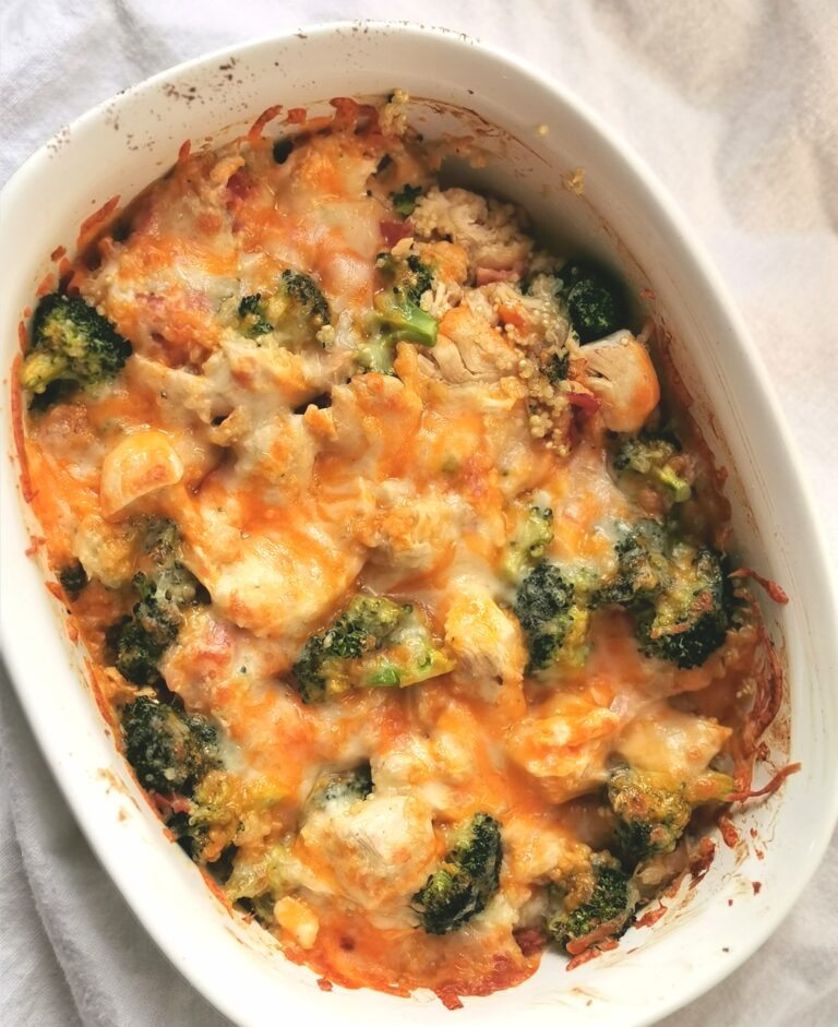 Une recette que je cuisine régulièrement et qui fait le bonheur de toute ma famille : cette casserole de poulet gratiné au bacon, quinoa et brocoli.