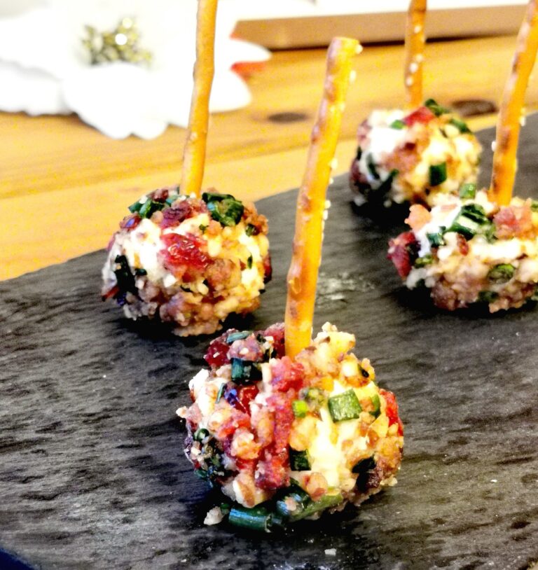 - Dans un bol, mélanger le bacon, la noix, les canneberges, la ciboulette, le sel et le poivre. Façonner environ 12 à 16 boules de chèvre à l'aide de vos mains. Enrober chaque boule dans la préparation de noix-bacon-canneberges. Insérer un Pretzels dans vos bouchées de chèvre