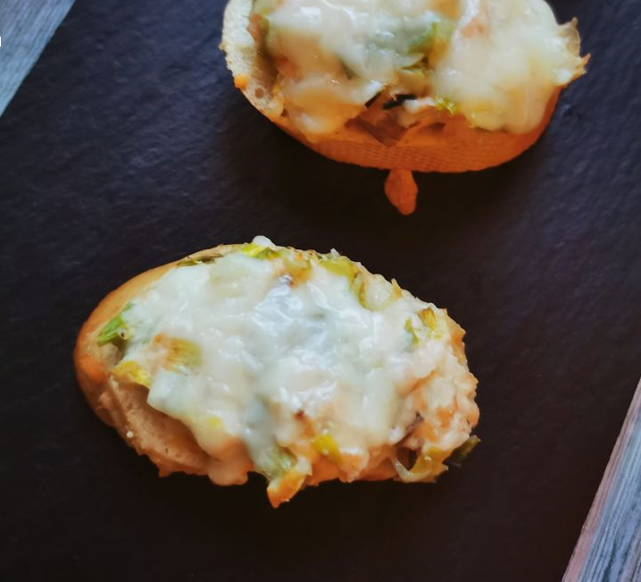 - Sur vos croûtons, déposer le poireau, de la salade de saumon et garnir de fromage. Cuire au four à 350 F pendant 5 à 7 minutes