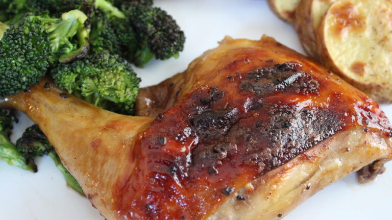- Cuire au four pendant 40 à 45 minutes. À la mi-cuisson, badigeonner de nouveau la peau des cuisses de poulet avec le 1/3 de la marinade réservée.