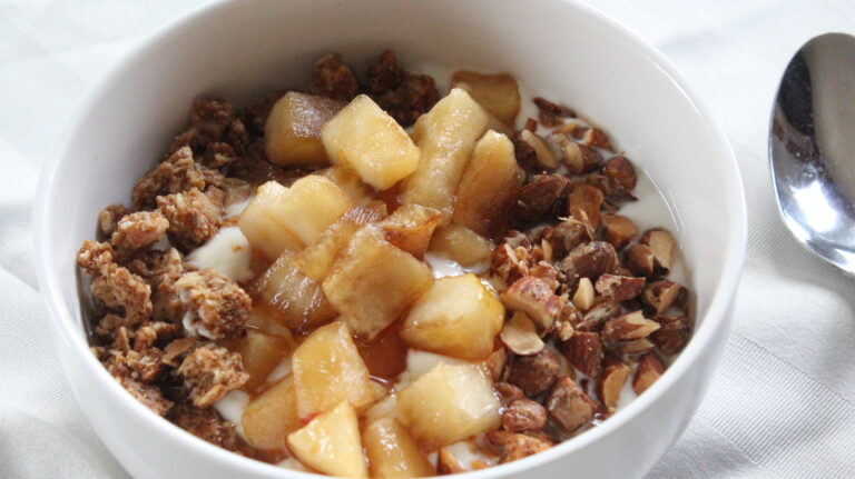 - Dans 2 bols, verser le yogourt puis garnir des amandes, des pommes caramélisées et des céréales granola
