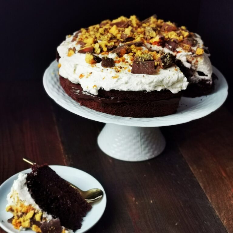 - Étendre la ganache entre les étages de gâteau, garnir de crème chantilly et de morceaux de chocolat Crunchie.