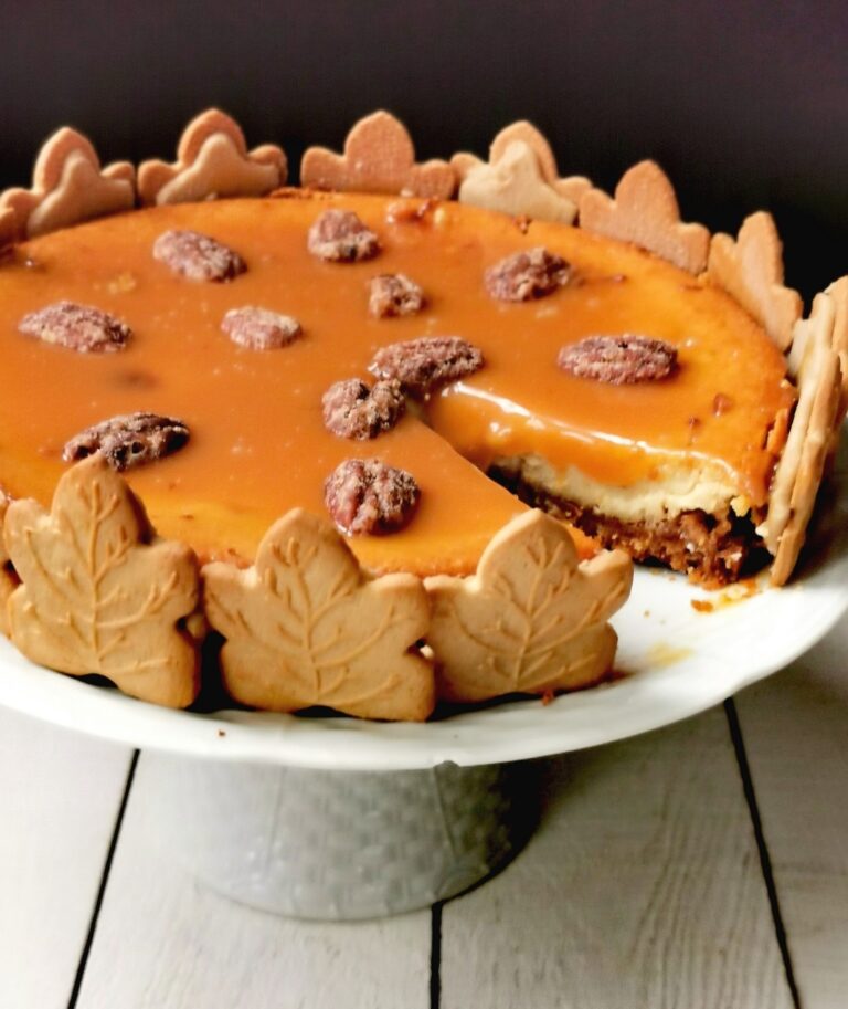 - Cuire au four 55 minutes ou jusqu’à ce que le dessus soit doré, mais que le centre bouge un peu. Laisser refroidir. Verser le caramel sur le gâteau et garnir de noix d'érable. Déposer des biscuits à l'érable tout le pourtour du gâteau.