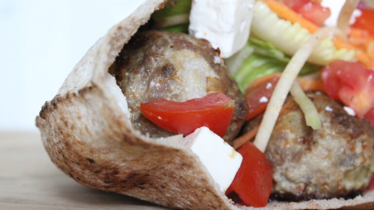 - Pour le montage, déposer les accompagnements et les boulettes dans les pains pitas puis garnir de sauce au yogourt.