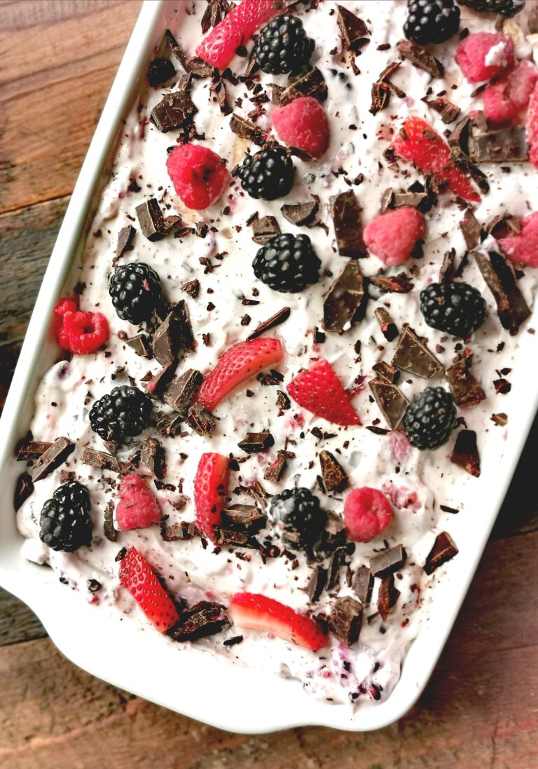 - Dans un moule rectangulaire, déposer des biscuits afin de recouvrir le fond de votre moule fond. Les couvrir d'une couche de la mousse aux fruits. Déposer un autre étage de biscuits, la mousse aux fruits, un autre étage de biscuits et le reste de la mousse aux fruits biscuits puis du reste de la préparation aux fruits. Garnir de chocolat haché et de petits fruits.