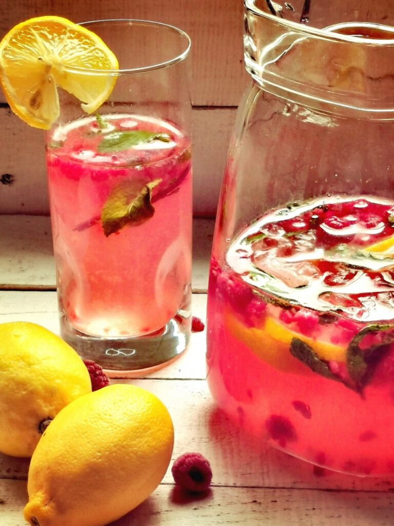 - Dans un grand pichet, mélanger tous les ingrédients en y ajoutant le sucre graduellement= Ajouter les feuilles de menthe, des glaçons et les framboises