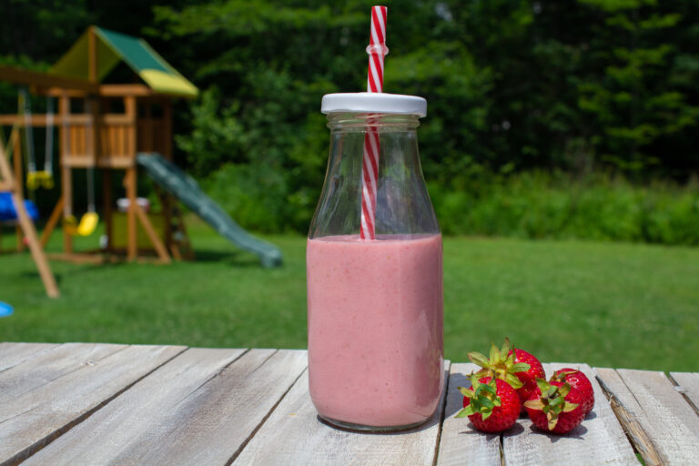 Une boisson fraîche, fruitée et un peu « décadente » : milshake aux fraises et au yogourt glacé.