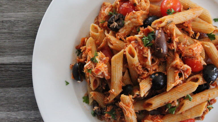 Cette recette de penne au poulet, au pesto de tomates séchées et aux olives vous plaira assurément !
