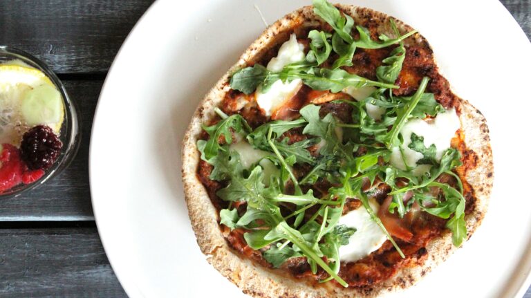- Étendre votre "sauce" d'aubergine sur les pains pitas. Garnir du reste de proscuitto, de mozzarella fraîche et cuire au four de 20 à 25 minutes. Au moment de servir, ajouter une belle poignée de roquette et garnir d'un filet de miel.