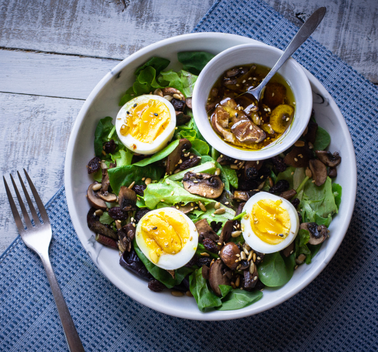 - Dans un bol, déposer votre salade, les champignons sautés, les oeufs, les graines de tournesol et les graines de sésame.