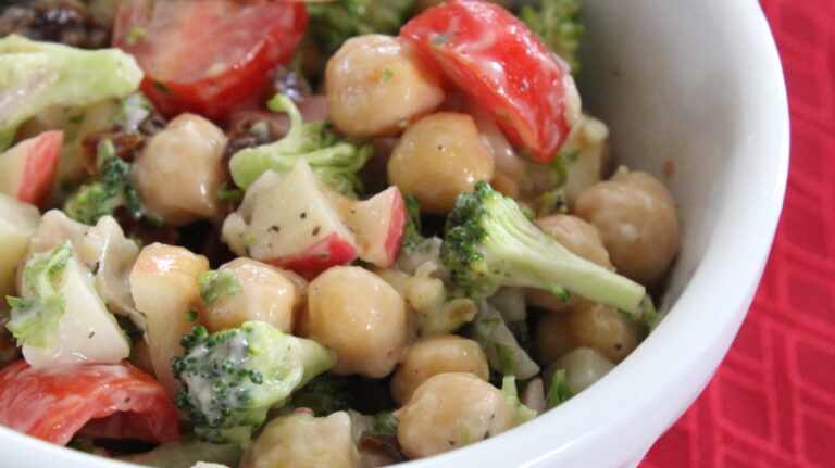 Salade crémeuse de pois chiches, jambon, brocolis et dattes