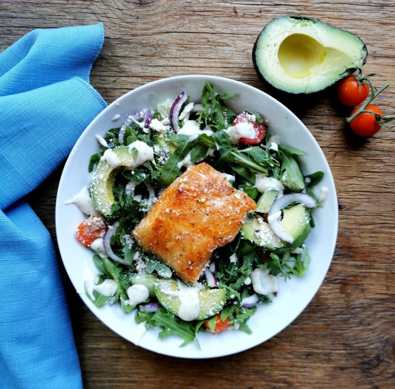 - Dans un bol, mélanger tous les ingrédients "pour la salade" et ajoutez-y de la vinaigrette tzatziki ou simplement une bonne huile d'olive, au goût. Déposer la salade dans une assiette et déposer un filet de saumon.
