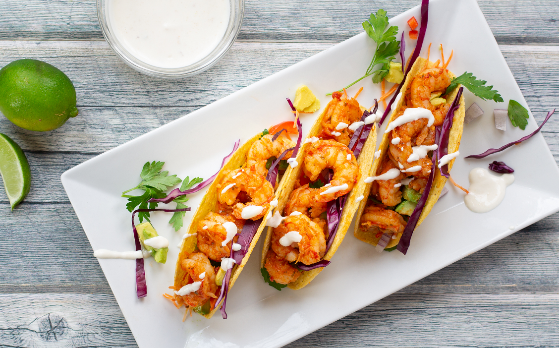 C’est la recette parfaite pour recevoir sans devoir passer des heures dans la cuisine. Imaginez, vous mettez les tacos, les crevettes, les garnitures et la sauce au centre de la table et les invités préparent eux-mêmes leur repas.