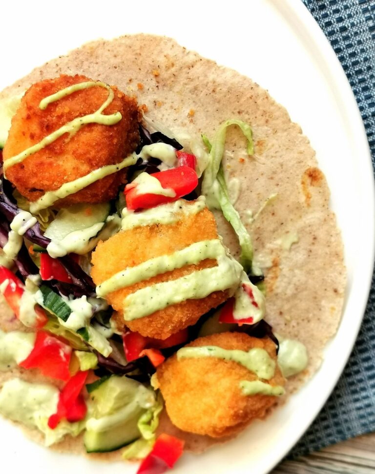 - Préchauffer le four à 375 F. Sur une plaque à cuisson tapissée d'un papier parchemin, faire cuire les croquettes pendant 30 minutes. Dans un petit mélangeur, déposer tous les ingrédients de la mayonnaise et mélanger jusqu'à ce qu'elle soit lisse. Rectifier l'assaisonnement au goût. Sur une tortillas déposer des croquettes, les légumes et de la mayonnaise.