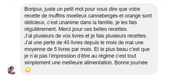 Je souhaite sincèrement que ces témoignages puissent vous encourager à persévérer dans vos saines habitudes alimentaires, parce que je sais à quel point il est trop facile de se mettre nous-même en « mode échec » quand on veut perdre du poids.