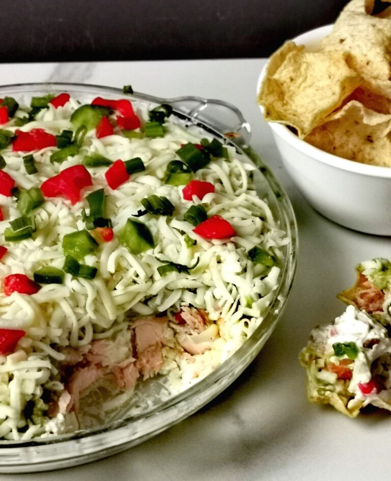 - Garnir de saumon, de saumon fumé et verser la guacamole. Couvrir de fromage et garnir des poivrons et oignon vert.